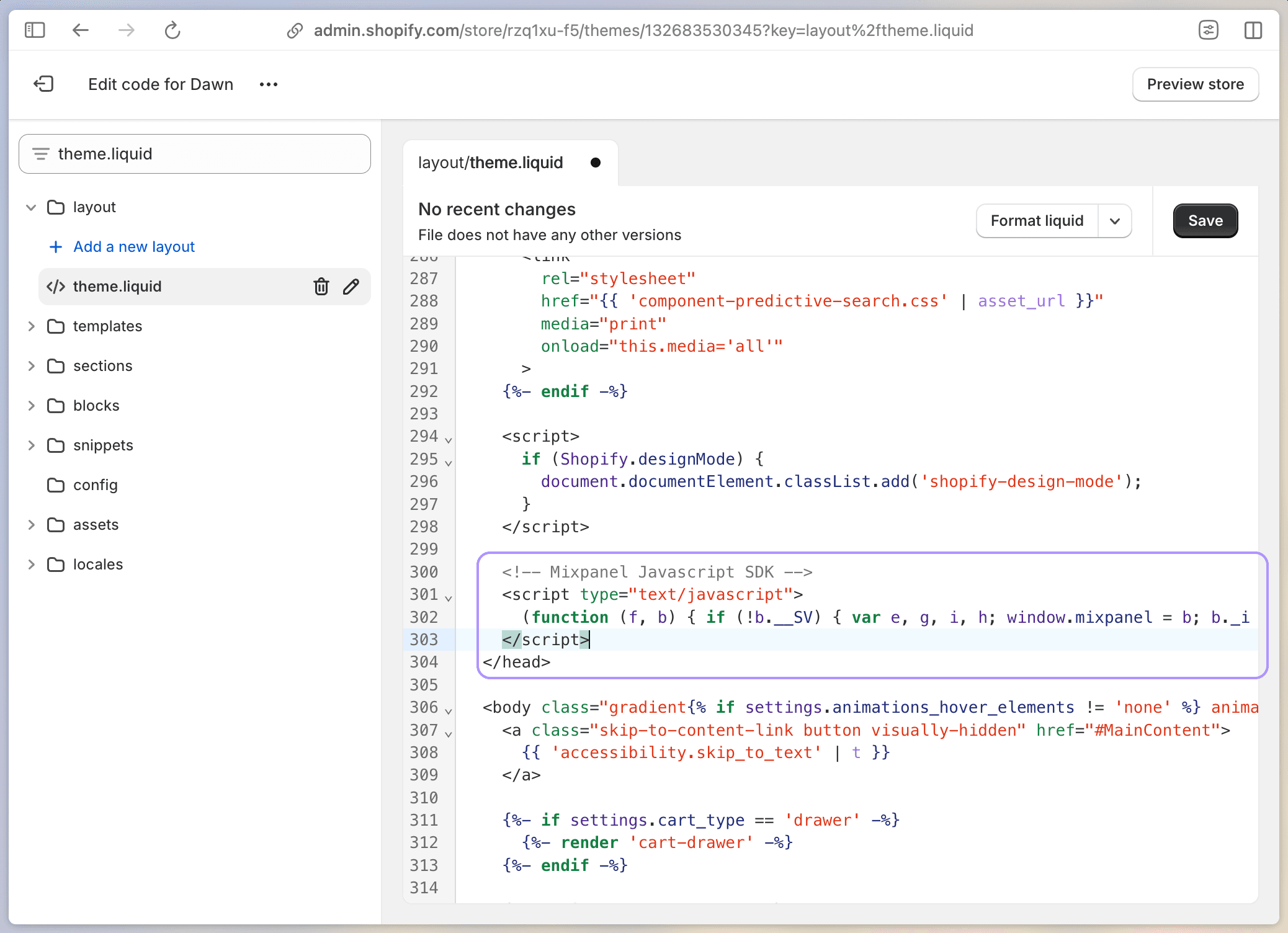 6. Back in your Shopify theme.liquid file, enable Mixpanel’s SDK by adding your Project Token to the mixpanel.init code (wrapped in script tags). Altogether, it should look like this: