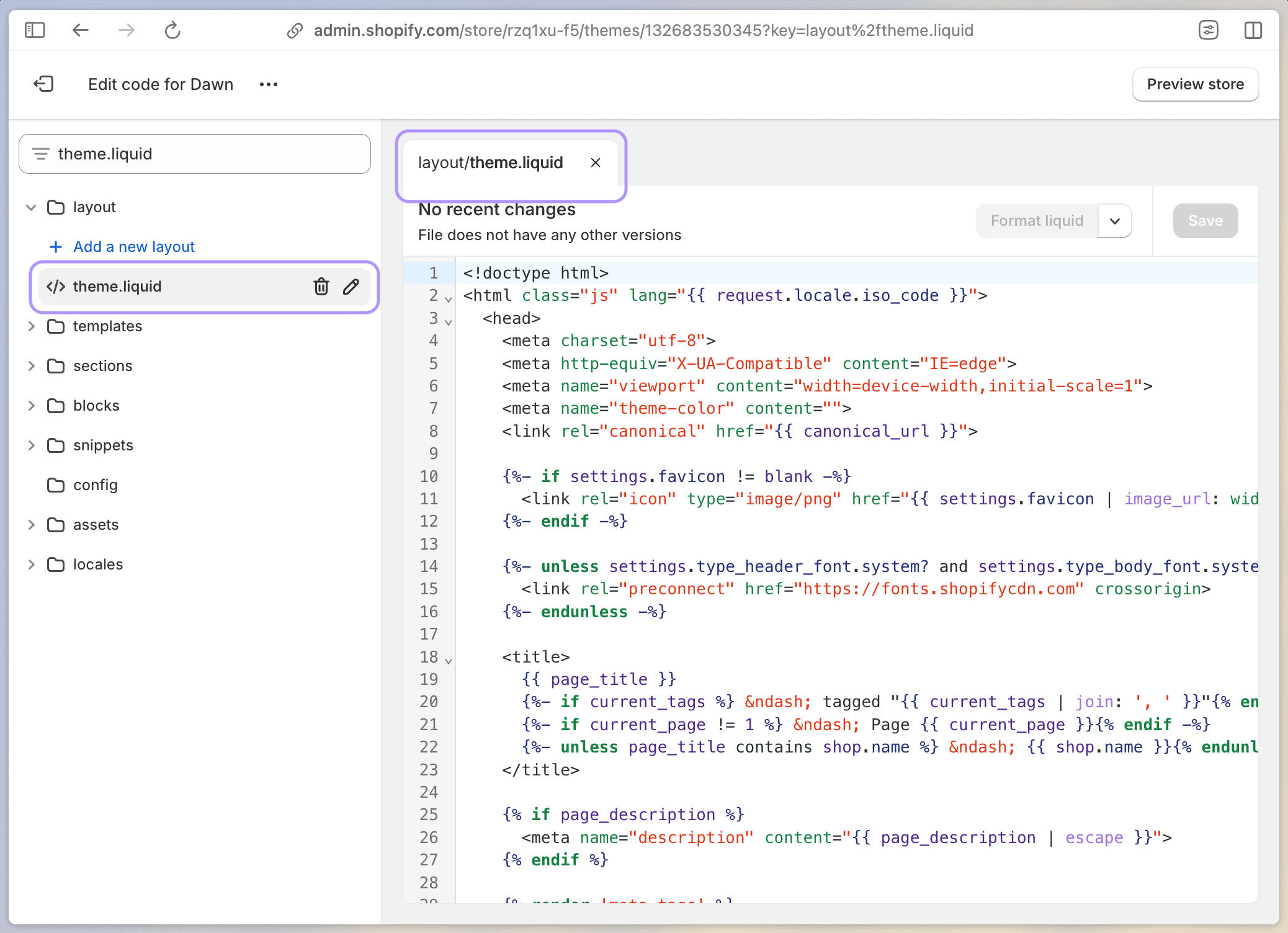 3. Open the theme.liquid file and scroll down to the closing </head> tag