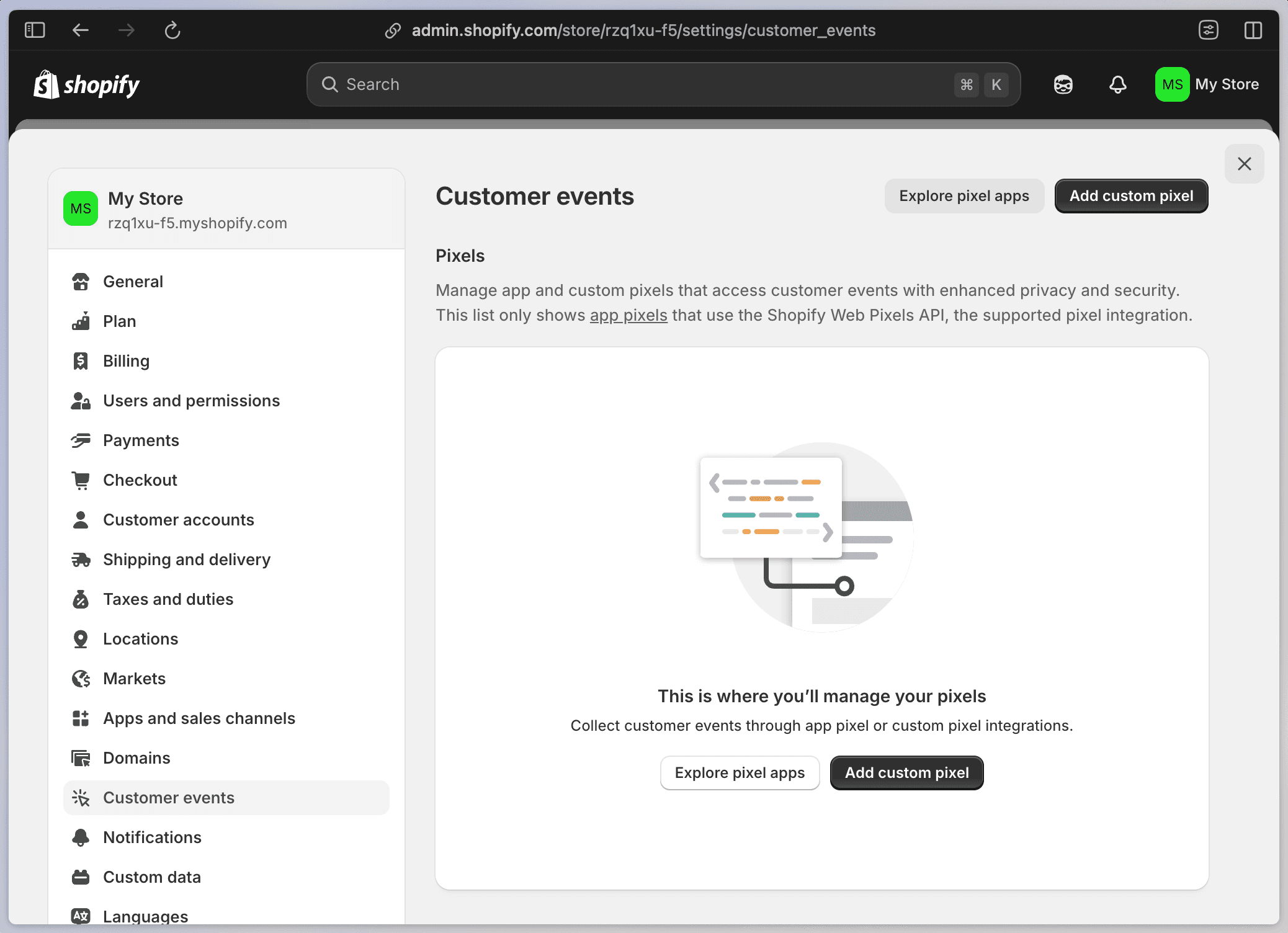 2. Go to your Shopify Store > Settings > Customer Events, click “Add custom Pixel”, and name your Pixel something snazzy